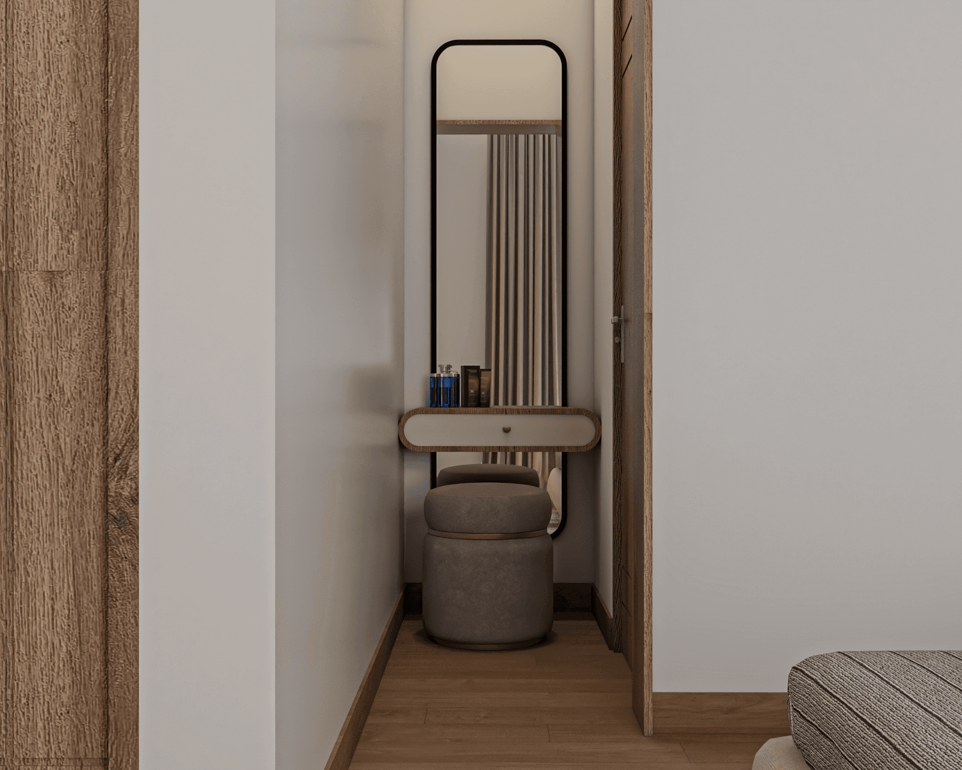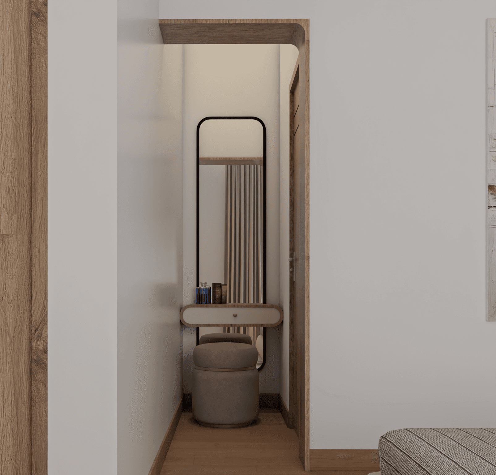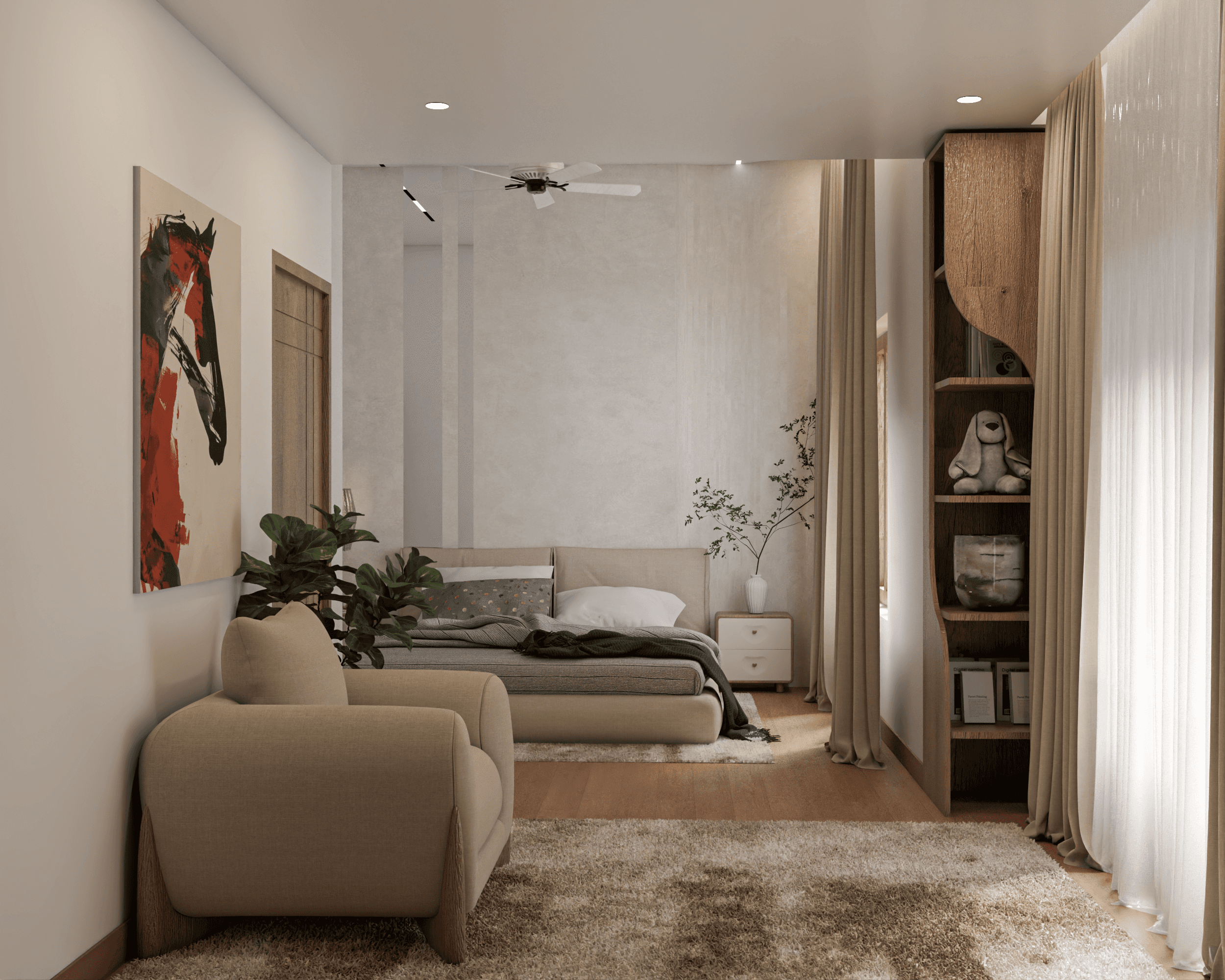 Created as a calm retreat, the bedroom uses soft tones, minimal furniture, and layered lighting to promote rest, comfort, and visual balance.