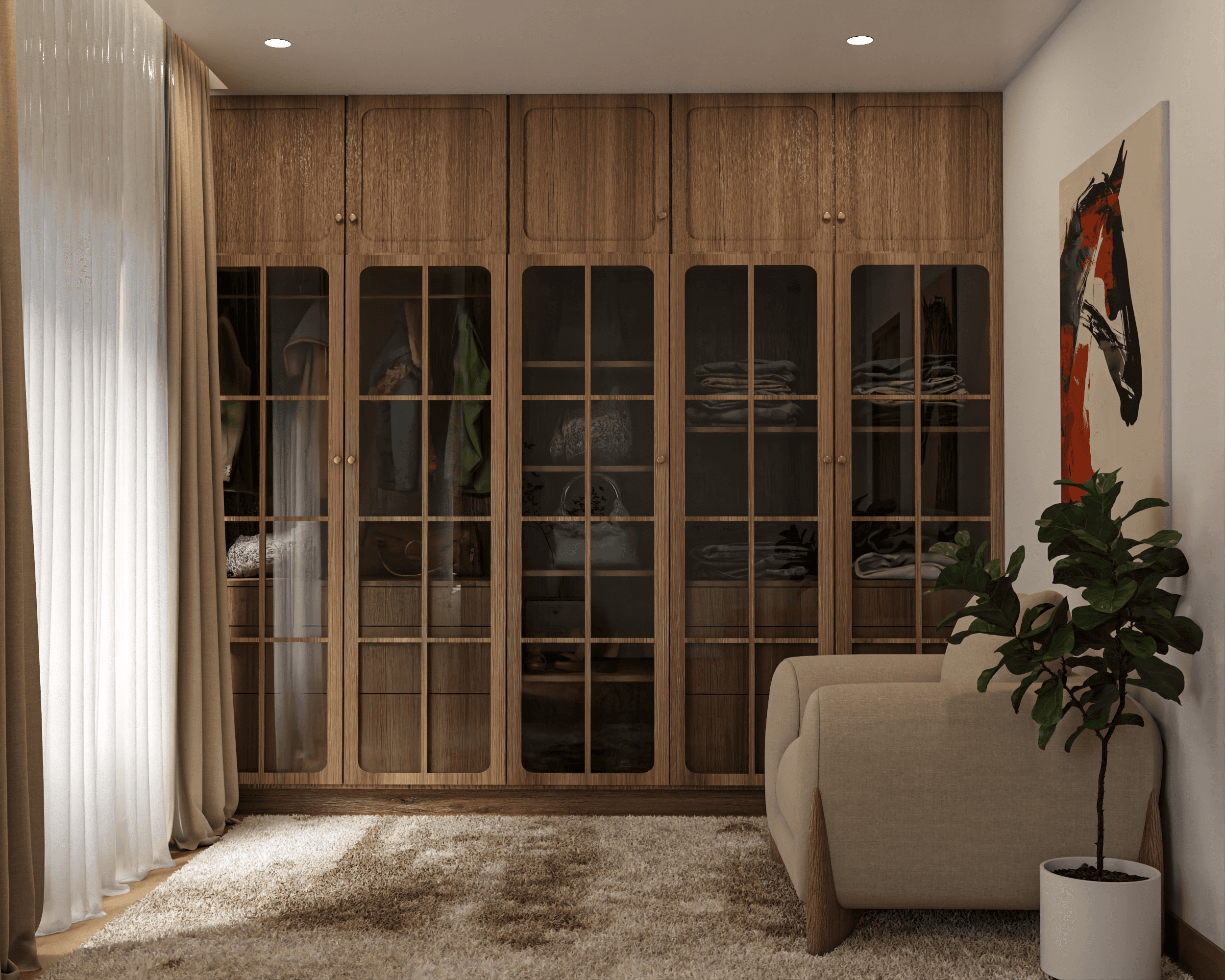Floor-to-ceiling curtains filter natural light gently into the room, enhancing its airy and serene character. Rich wooden flooring and custom-built wardrobes with framed glass panels bring a sense of craftsmanship and functionality, offering generous storage while maintaining visual elegance.